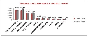 Così come per il primo periodo considerato (trimestre), anche per i primi sei mesi del 2014 tutti i settori (ad esclusione di “Telecomunicazioni”) presentano un trend in riduzione rispetto allo stesso periodo del 2013. Infatti: