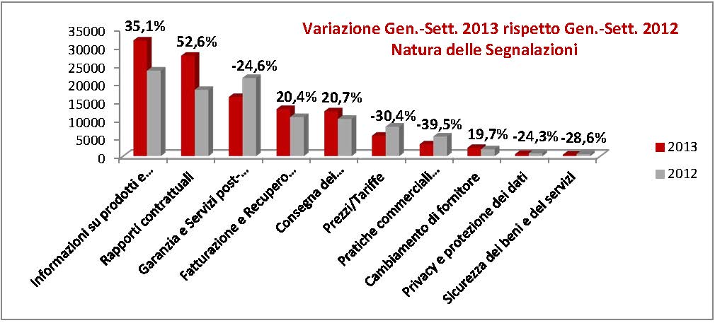 - Da gennaio a settembre è importante la voce relativa alla richiesta di “Informazioni su prodotti e servizi” (+35,1%) legato alla ricerca della miglior scelta nel settore energetico, economico-finanziario (c/c ed investimenti in generale), nella telefonia mobile ed offerte combinate ed, infine, in quello dei beni di consumo in generale.
