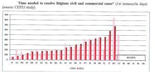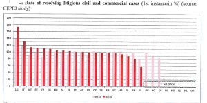 Nello “scoreboard” 2014 sui sistemi di giustizia nella UE del Cepej (European Commission for the Efficiency of Justice del Consiglio d’Europa), l’Italia registra un miglioramento per quanto riguarda il tasso di risoluzione delle controversie civili in prima istanza (l’Italia è al secondo posto tra i migliori con il 130% di casi risolti nel 2010 dove 100 indica il numero di nuovi casi all’anno, vedi tabella 1), ma rimane al primo posto per numero di litigi pendenti (5,5 su 100 abitanti contro una media UE inferiore ai 3 casi per cento abitanti, dato peraltro in miglioramento rispetto agli oltre 6 del 2010) e soprattutto, e questo è il dato più negativo, non vi sono miglioramenti, anzi la situazione peggiora, per quanto riguarda la durata di risoluzione delle controversie civili, dove l’Italia si colloca al penultimo posto per numero di giorni necessari a risolvere litigi in prima istanza (quasi 600 giorni nel 2012 rispetto ai quasi 500 nel 2010, vedi tabella 2), a fronte dei 310 impiegati in Francia, dei 180 in Germania e dei 240 nell’area OCSE.