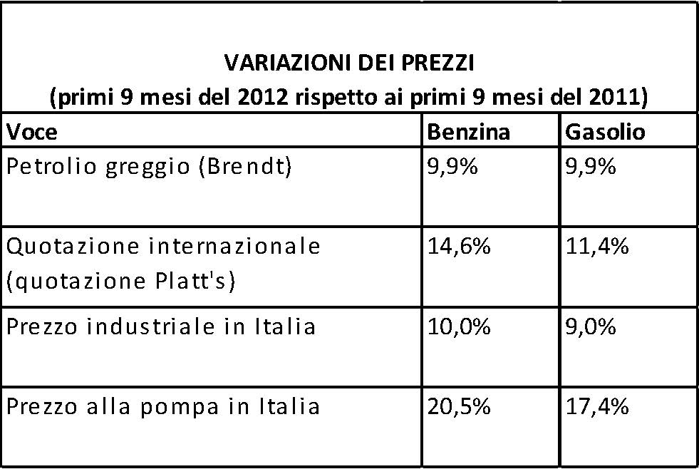 Veniamo infine ai costi. La tabella che segue confronta l’andamento dei prezzi di riferimento più significativi: il petrolio, il prezzo internazionale dei carburanti, il prezzo industriale interno e il prezzo al consumo interno. Ciò che mostriamo è la variazione nei primi 9 mesi del 2012 rispetto ai primi nove mesi dell’anno precedente. Ebbene, i dati sono inequivocabili: il prezzo del petrolio è cresciuto del 10%. Esso è stato interamente riassorbito dalla crescita dei prezzi industriali interni. Il prezzo internazionale ha subito addirittura una crescita superiore.
