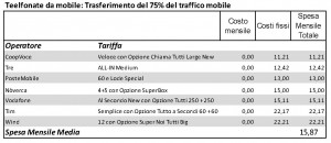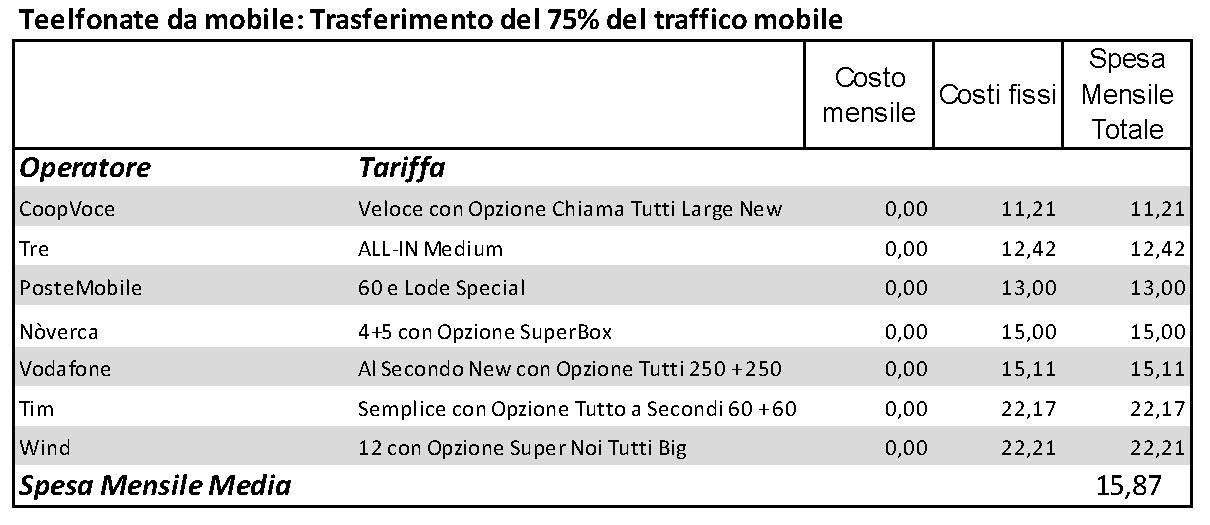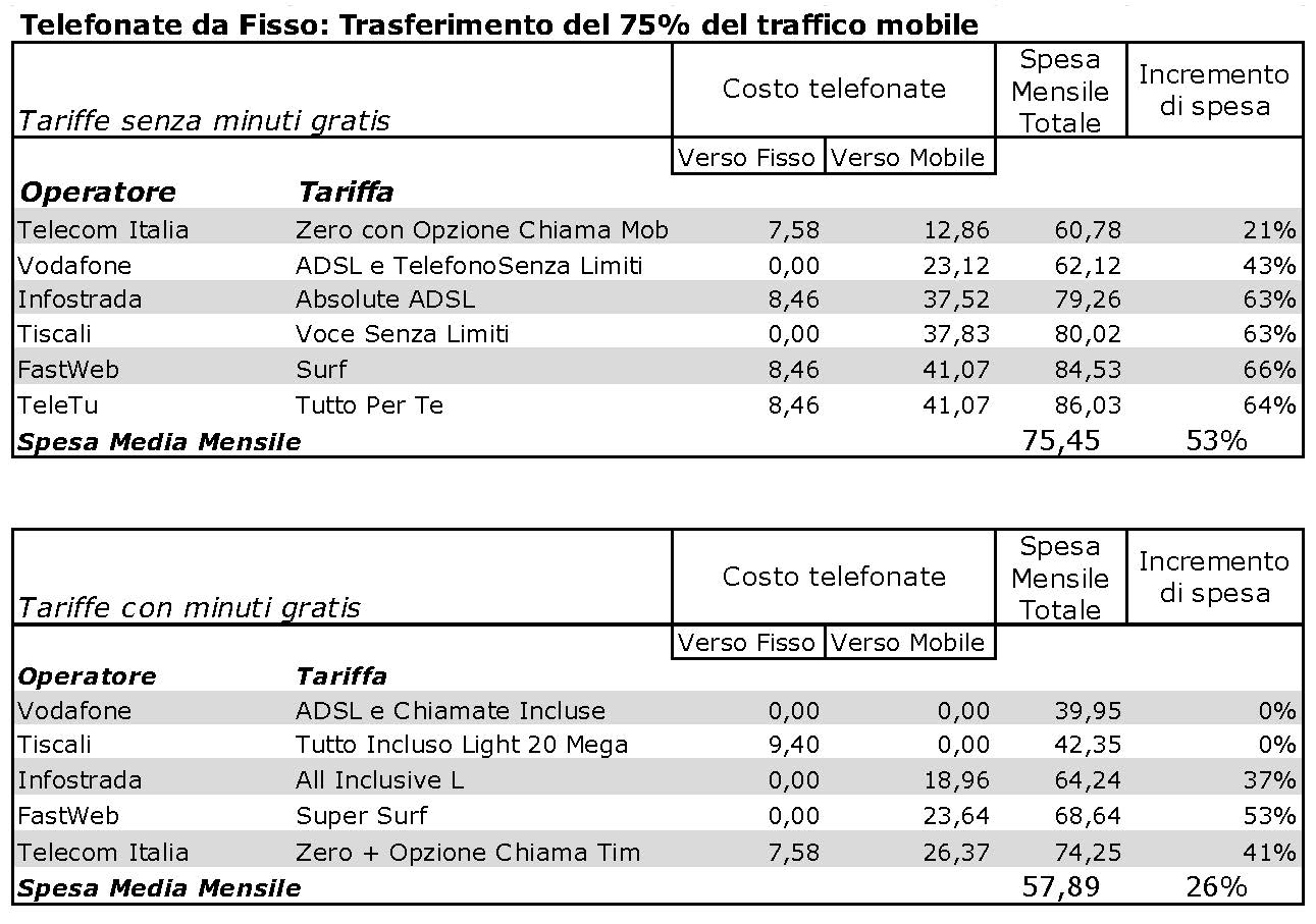 Le tariffe senza minuti gratis subiscono un forte incremento, come era logico immaginare. La spesa del traffico da cellulare non varia. Questo accade perché le tariffe oggi più convenienti includono nel canone mensile dei minuti gratis. La spesa media delle tariffe di telefono fisso con minuti gratis è aumentata. Le due tariffe più convenienti di questo gruppo si discostano, però, dal trend crescente. La loro spesa mensile è invariata poiché la soglia di minuti gratis offerta in un mese (1000 minuti per la prima tariffa e 500 minuti per la seconda) è abbastanza alta da assorbire completamente gli oltre 140 minuti trasferiti sul telefono fisso.