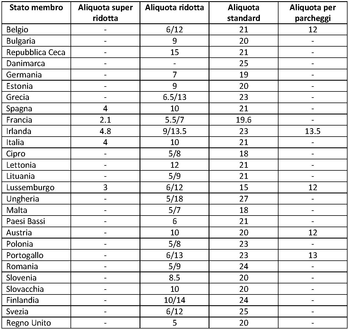 L'aliquota ordinaria varia tra il minimo del Lussemburgo (15%) ed il massimo dell’Ungheria (27%), quasi tutti i paesi applicano aliquote ridotte (5-18%) ma ben pochi applicano aliquote super ridotte (il nostro 4%).