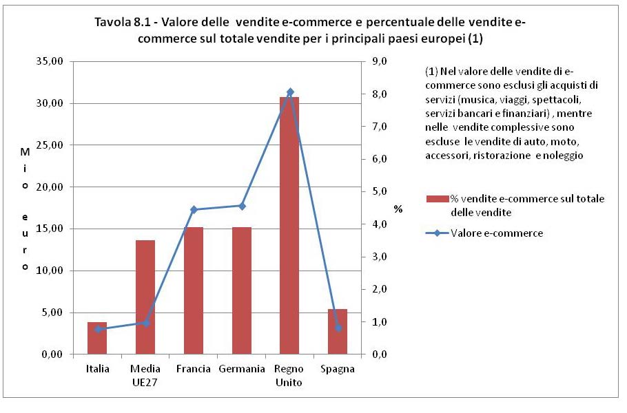 Questa ridotta importanza dello shopping online in Italia si evidenzia con maggior forza dal confronto con i principali paesi europei. Come mostra la tabella Tavola 8.1, il valore medio delle vendite di beni nell’Unione Europea a 27 paesi risulta pari al 3,5% del totale fatturato del commercio al dettaglio contro un dato italiano di circa l’1%. Si tratta di una percentuale più bassa non solo della Francia (3,9%), della Germania (3,9%) e del Regno Unito (7,9%), ma anche della Spagna (1,4%); un peso che tuttavia è cresciuto nel corso dell’ultimo periodo, soprattutto per la forte contrazione delle vendite nel commercio fisico.