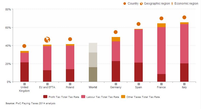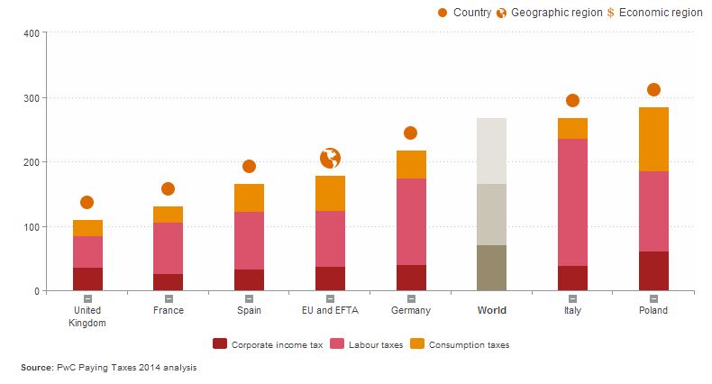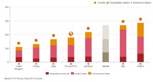 I risultati di PWC attestano che il peso fiscale (reddito d’impresa + cuneo fiscale + altri tributi) di Italia e Francia è il 50% in più della media UE/EFTA